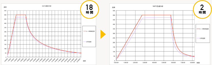 サンプルをご持参いただき、急速冷却のワークテストを行ったところ、これまで行っていた冷却方式(500℃真空冷却)に比べて大幅短縮となる2時間での冷却が実現可能であることが判明した。