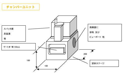 1. チャンバーユニット:チャンバー、ゲート弁、スパッタ源(または蒸着源orプラズマ源)、ビューポート、