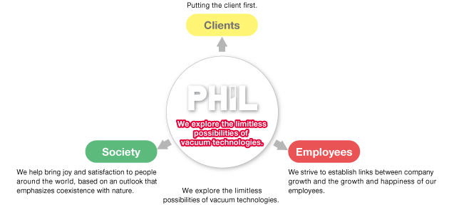 At present, vacuum technology is finding increasing applications in industrial fields as diverse as space development,electronics, energy, physics and chemistry, the electrical industry, pharmaceuticals, foods, optics,automobiles, and metals. Vacuum technology makes major contributions at every stage from research and development to production and every one of us shares in the benefit. Over the past 75 years, PHIL SATO VAC INC., as a supplier of integrated vacuum products, has been conducting research and development from the customer's standpoint aiming at innovations in vacuum pumps and vacuum gauges, component technologies for manufacturing vacuum parts, and a range of vacuum equipment for vacuum drying, vacuum baking, vacuum heat treatment, vacuum thin films, ultra-high vacuum pumping systems, and vacuum impregnation. The foundation for PHIL's corporate activities is the principle that "Customers come first." Based on this PHILosophy, we consider it our mission to realize the vast potential of vacuum technology under the motto "technologies that create clean vacuum", and to provide products that satisfy our customers' needs. I would like to thank you all in anticipation of your continued support for PHIL SATO VAC INC.